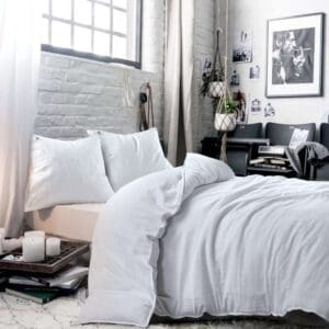 • Lichtblauwe dekbedovertrekset met kussenhoes op bed