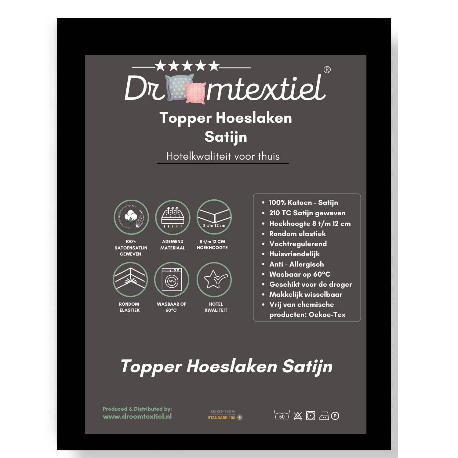 Met het Droomtextiel luxe katoen-satijn topper hoeslaken kies je voor topkwaliteit, comfort en duurzaamheid. Maak van je bed een royaal hotelbed thuis, elke nacht weer. Dankzij onze 100% klanttevredenheidsgarantie kun je zonder zorgen bestellen en uitproberen.