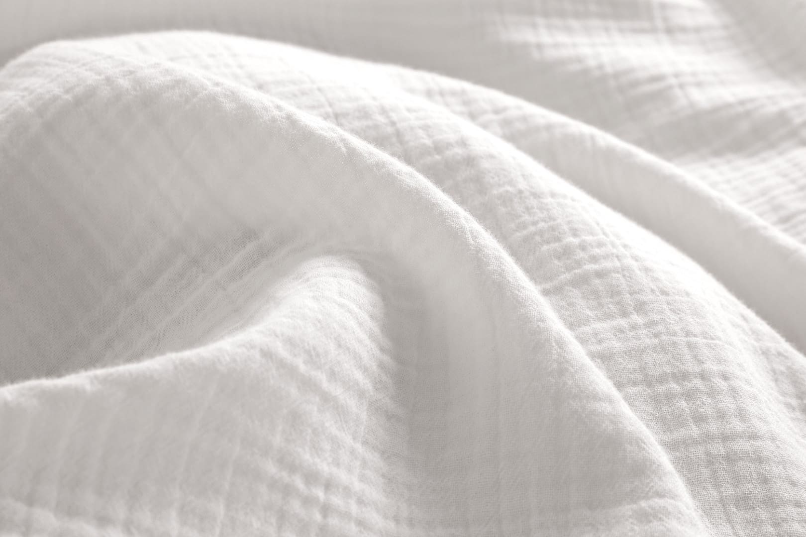 Mousseline, ook wel double gauze genoemd, is een unieke stof die bestaat uit twee fijne lagen los geweven katoen. Deze zijn op enkele punten subtiel met elkaar verbonden, waardoor een karakteristieke, natuurlijke kreukstructuur ontstaat – het bekende crinkle-effect.