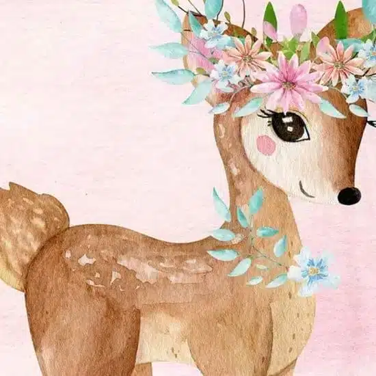 • Design: Bambi Hertje – pastelroze achtergrond met bloemen, lief hertje met bloemenkrans, achterzijde blauw met wit stippendessin