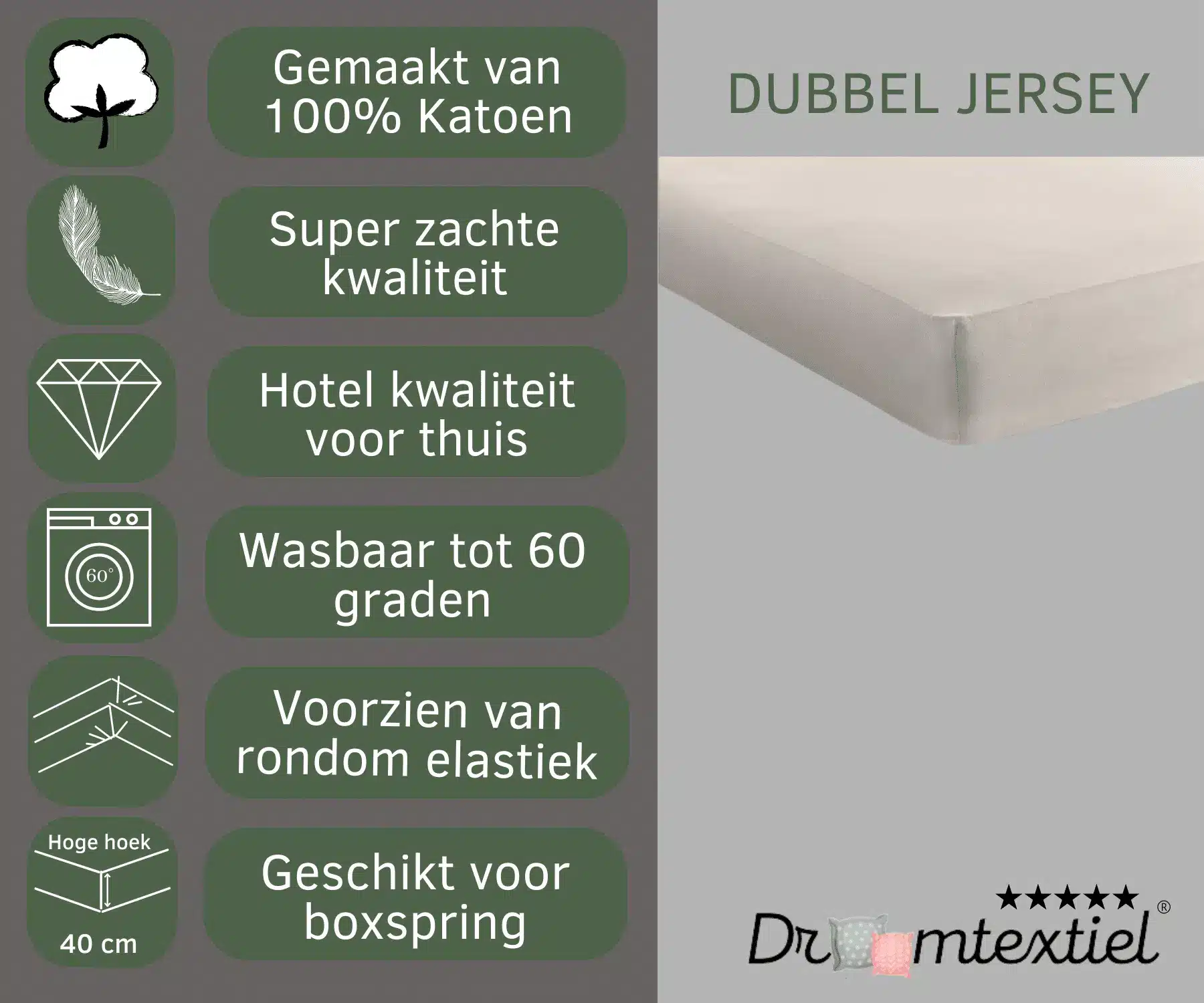 Met het Droomtextiel dubbel jersey hoeslaken kies je voor ultieme luxe, betrouwbare kwaliteit en ongeëvenaard comfort. Dankzij de hoogwaardige 100% katoen weving, 40 cm hoekhoogte en duurzaam elastiek geniet je elke nacht van een perfecte pasvorm. De antiallergische, ventilerende eigenschappen en het kreukvrije karakter maken het onderhoud eenvoudig en stressvrij.