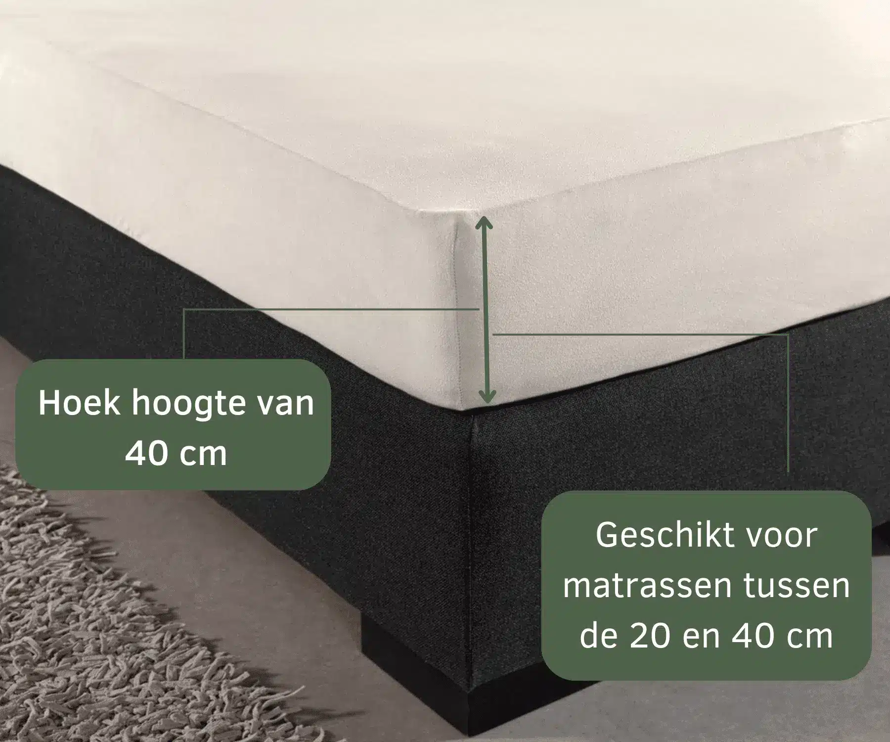 Een hoeslaken dat losraakt, geeft onrust en verstoort je nachtrust. Ons hoeslaken 90×200 (en alle andere maten) is voorzien van duurzaam elastiek rondom en een hoekhoogte van 40 cm. Dat betekent dat het doek diep om je matras valt en niet verschuift – zelfs niet bij draaikonten-slaapwandelaars!
