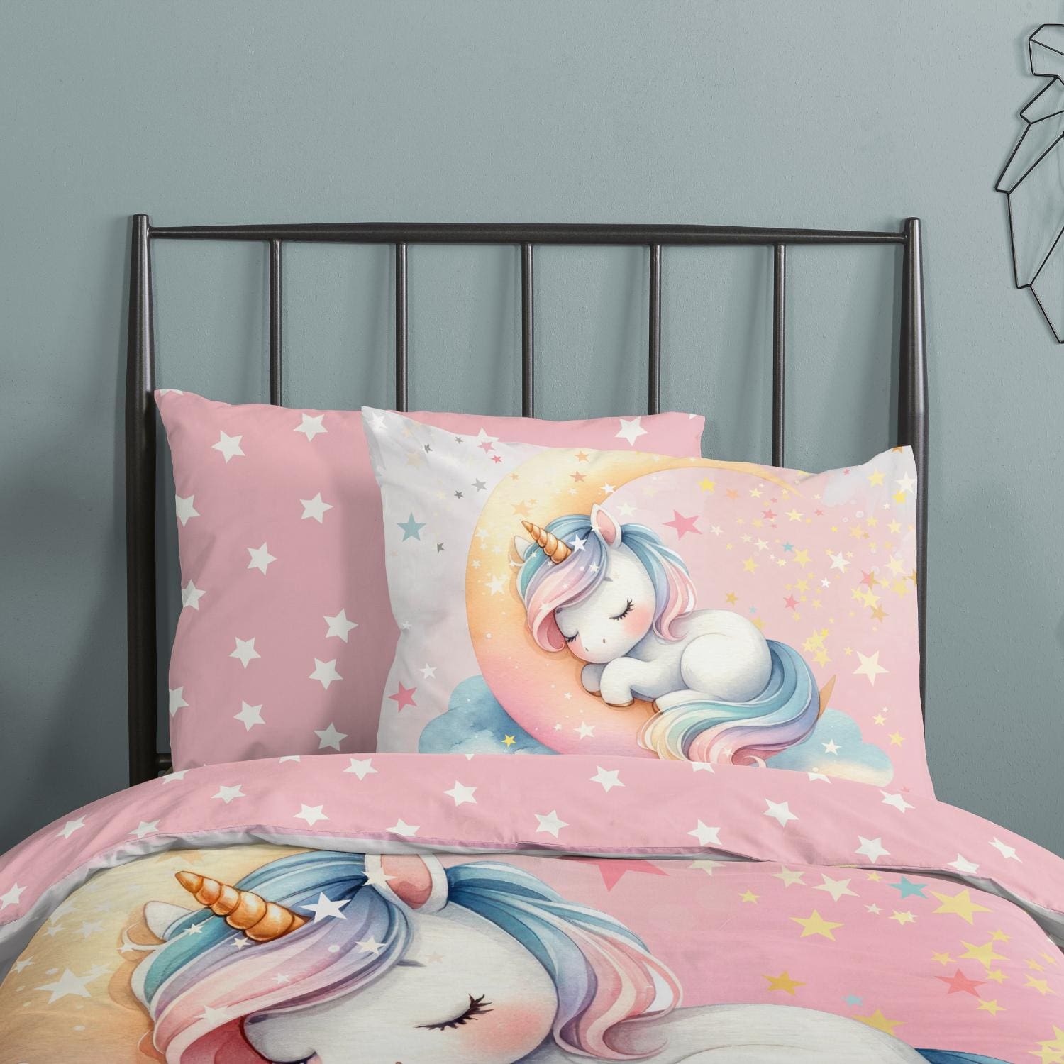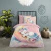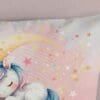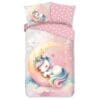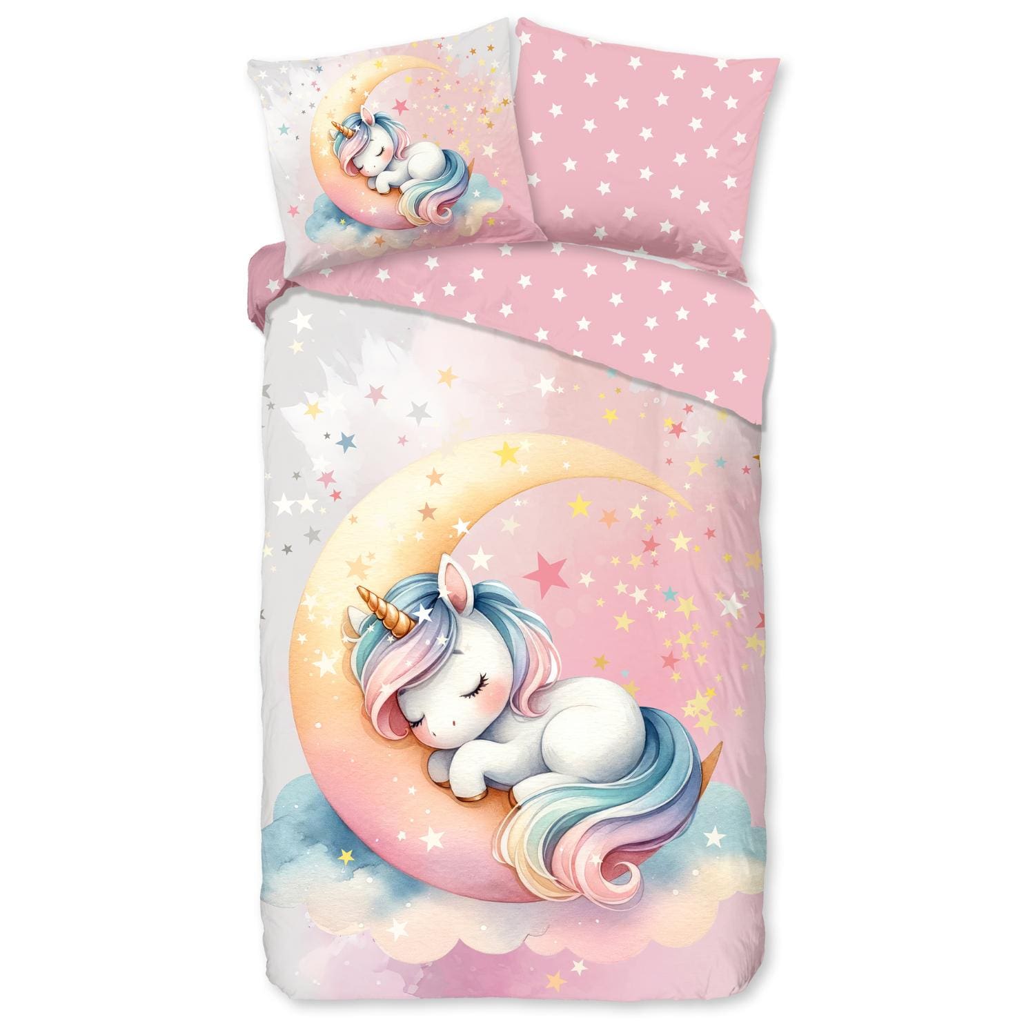 Laat je kind elke nacht wegdromen in een wereld vol fantasie, sterren en eenhoorns met dit betoverende kinderdekbedovertrek van Good Morning. Het ontwerp Magical Moon Unicorn brengt magie tot leven op het bed: een lieve, dromerige eenhoorn ligt rustig te slapen op een maan, omringd door kleurrijke sterren in pastelkleuren als roze, geel, wit en lila. Het kleurverloop van wit naar zachtroze creëert een rustgevende sfeer, terwijl speelse details zoals wolkjes en sterretjes zorgen voor een sprankelend geheel.