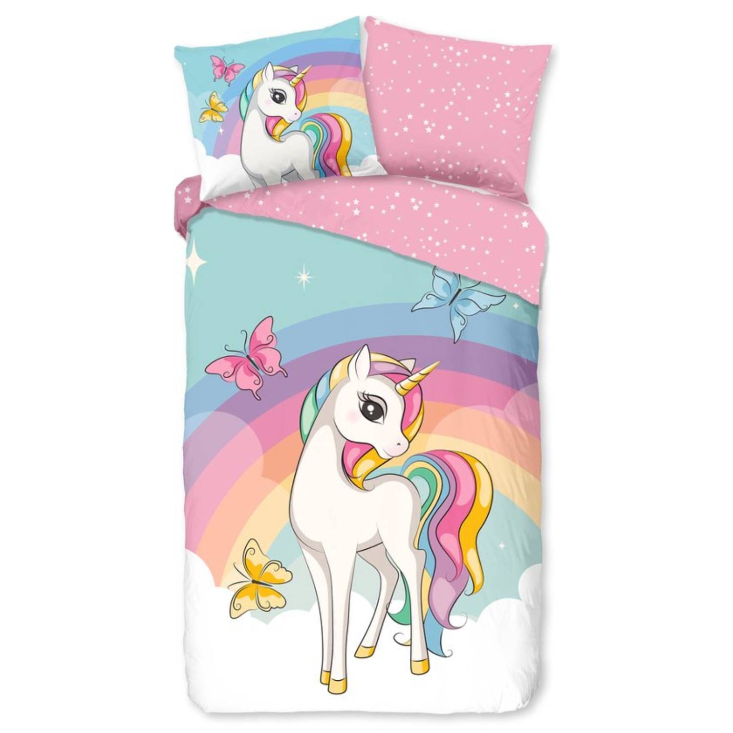 “Mijn dochter is stapelverliefd op de eenhoorn en regenboog. Het dekbedovertrek voelt zacht aan en blijft mooi na elke wasbeurt.”