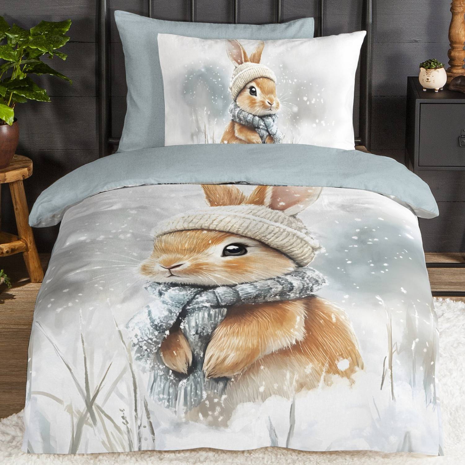 Het winterse ontwerp toont een lief konijn met een warme muts en een zachte sjaal, omringd door sneeuw. Een schattige print die zorgt voor een knusse en vrolijke sfeer in de slaapkamer.