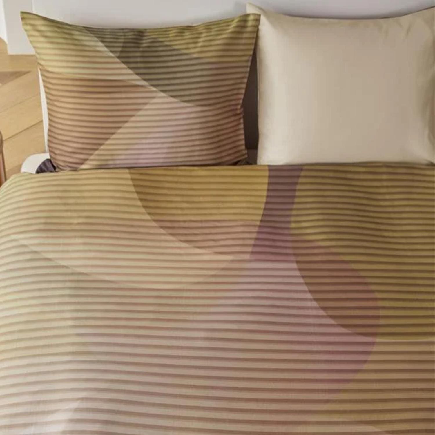 Dekbedovertrek Illuminate van Kardol by Beddinghouse schittert door vloeiende vormen die met licht en kleur spelen. Geïnspireerd door kunst, mode en architectuur, vangt dit ontwerp de innovatieve vormentaal van Artificial Intelligence, maar dan met de hand vervaardigd. Het ton-sur-ton streepmotief voegt diepte en elegantie toe, waardoor het geheel een betoverende uitstraling krijgt. De kleuren variëren van warm goud en terra tot nude, zachtroze en diep bordeauxrood. De achterzijde heeft een effen champagnekleur.