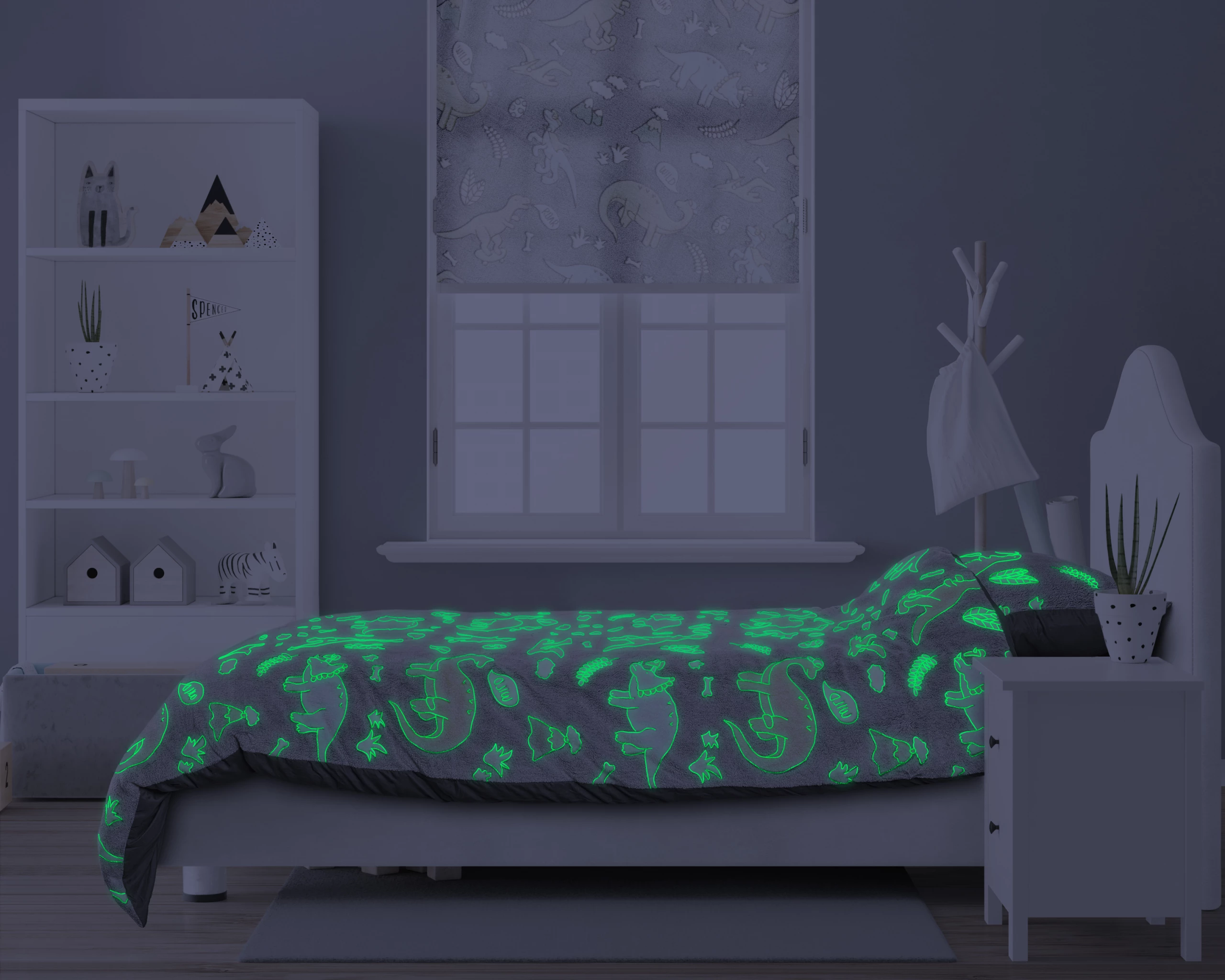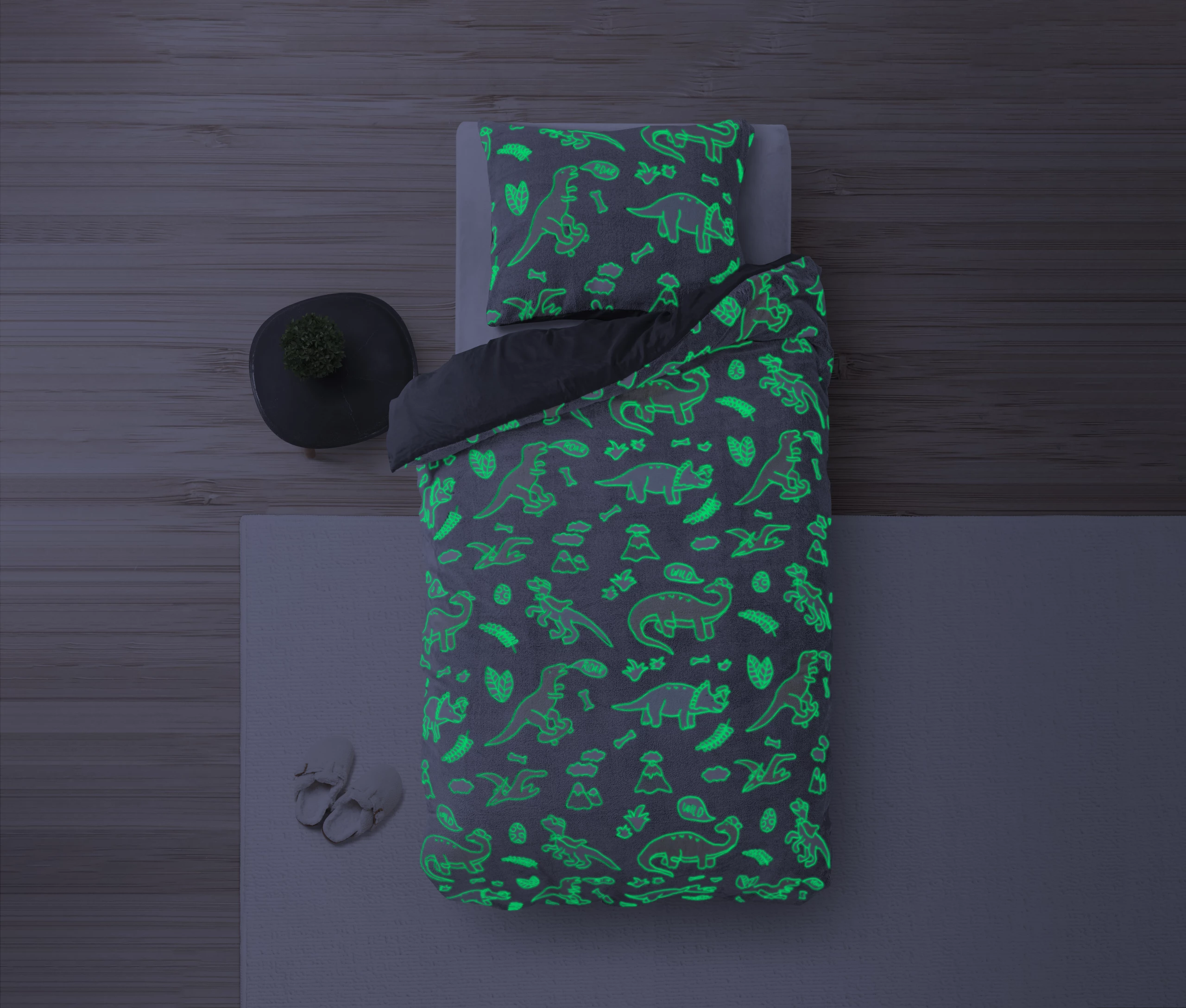Verras een echte dinofan met het Droomtextiel Dinosaurs Glow in the Dark dekbedovertrek! Overdag stoer en kleurrijk met een gave dino print, ’s nachts extra spannend door het glow in the dark-effect. Gemaakt van heerlijk zachte teddy microfleece, waardoor het dekbed warm en knus aanvoelt. Perfect voor kinderen die van dino’s houden en graag wegdromen in hun eigen dinowereld.
