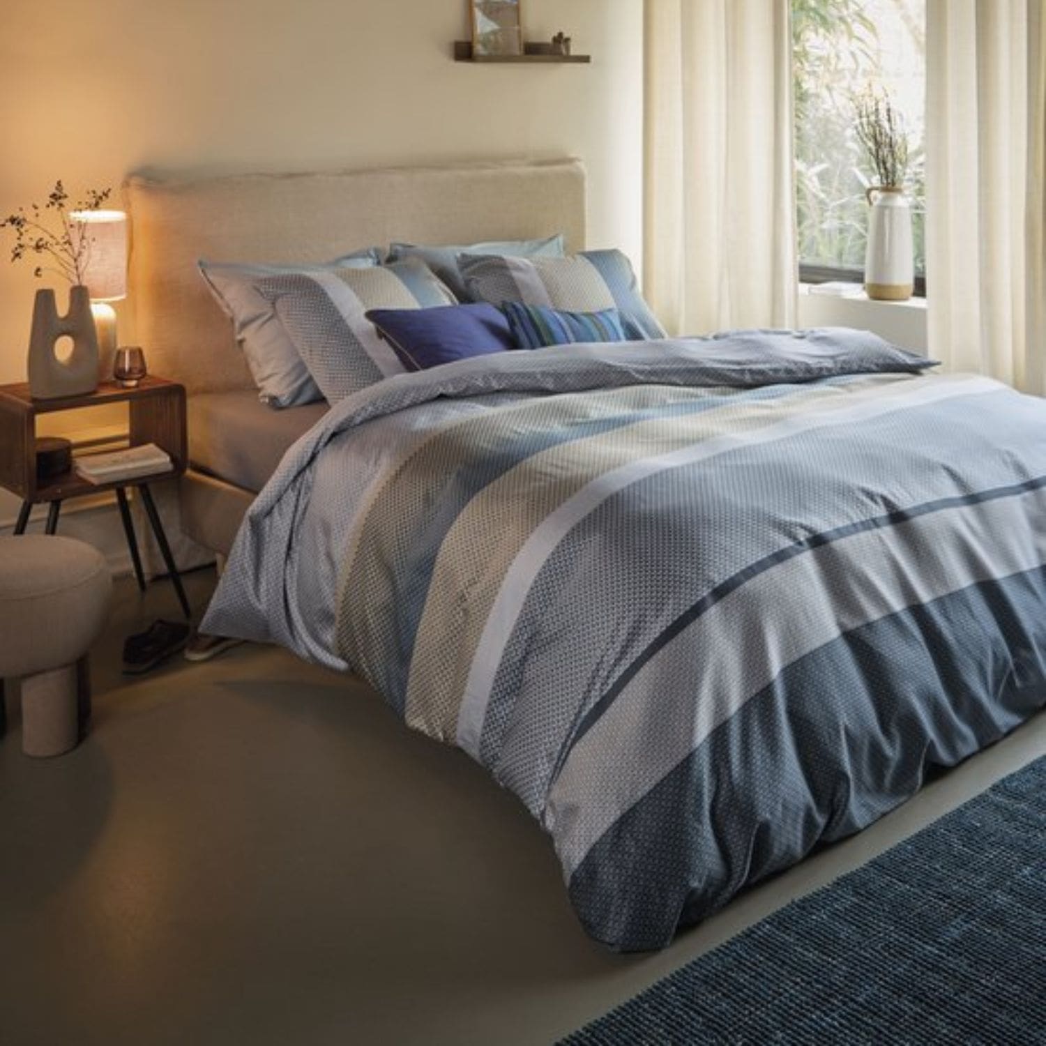Droom heerlijk weg onder het stijlvolle Beddinghouse Marthe dekbedovertrek. Het dessin bestaat uit een modern banenpatroon in rustgevende blauw- en aardetinten. Van dichtbij zie je subtiele grafische details die het geheel een eigentijdse en speelse twist geven. Dankzij dit rustige kleurpalet past het dekbedovertrek moeiteloos in diverse interieurstijlen.