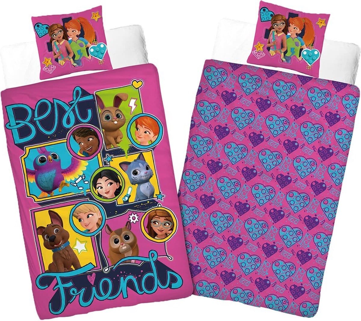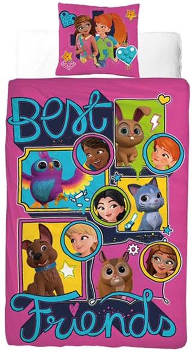 Voor fans van de populaire Lego Friends-collectie is dit dekbedovertrek een onweerstaanbare eyecatcher. Aan de ene zijde stralen Mia, Emma, Andrea, Stephanie en Olivia, omringd door hun lieve diertjes. Draai het om voor een speelse roze print met paarse en blauwe hartjes. Welke kant kies jij?