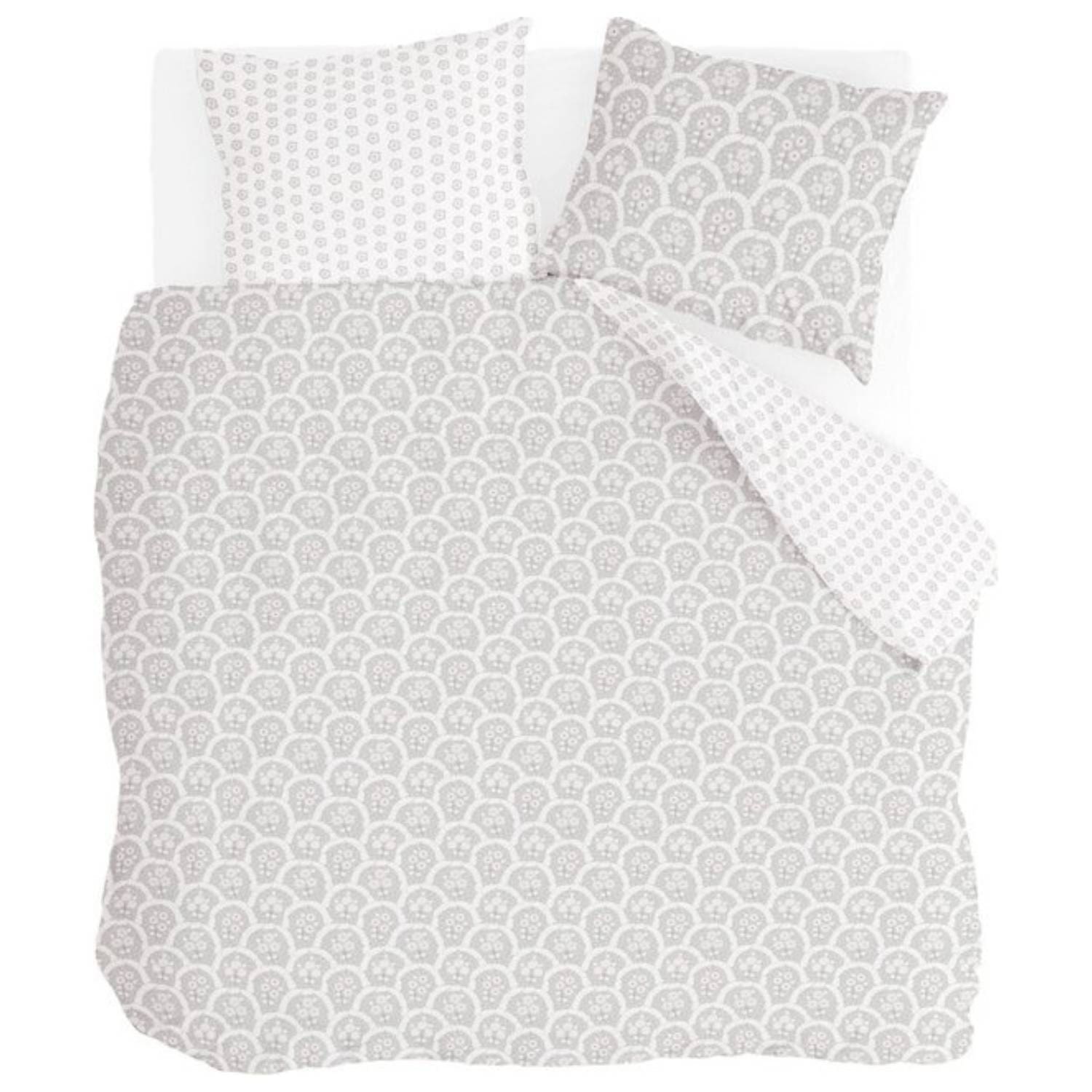 De ene zijde van het overtrek is versierd met een fleurige print van talrijke bloemetjes die elegant in witte boogjes lijken te zijn gevlochten. Een subtiel contrast tussen de gevlochten motieven en de lichtgrijze achtergrond zorgt voor een chique uitstraling.