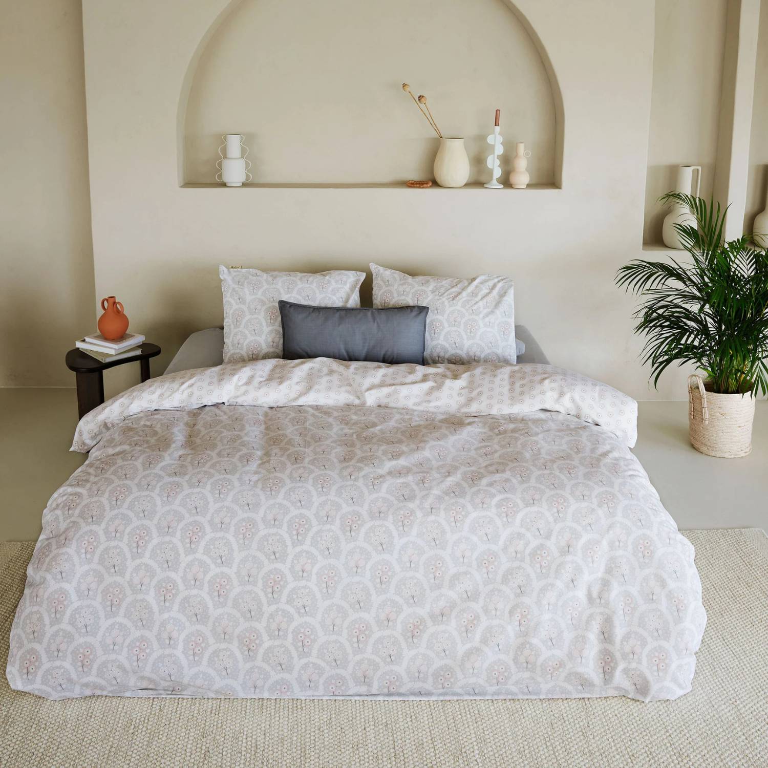 Op de andere zijde vind je een rustig patroon van kleine grijze bloemetjes met zachte roze accenten. Deze serene print creëert een kalme, ontspannende sfeer in je slaapkamer. Zo kun je met één dekbedovertrek eindeloos variëren en jouw interieur elke keer weer een nieuwe twist geven.