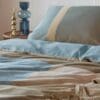 Geïnspireerd door de iconische mode van Hermès, biedt het design een intrigerende mix van intense zand- en bruintinten, subtiel overlopend naar koel grijsblauw. Accenten van lichtblauw en nude schakeringen zorgen voor een moderne, eclectische sfeer in iedere slaapkamer. Het verfijnde grid van vloeiende lijnen, geïnspireerd op een elegante slangenprint, geeft nét dat beetje extra verfijning dat je gewend bent van hotelkwaliteit.