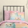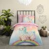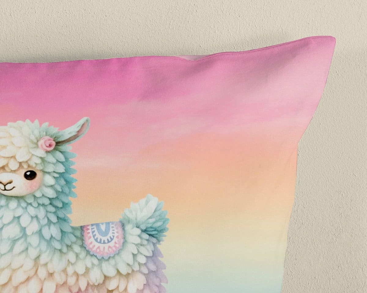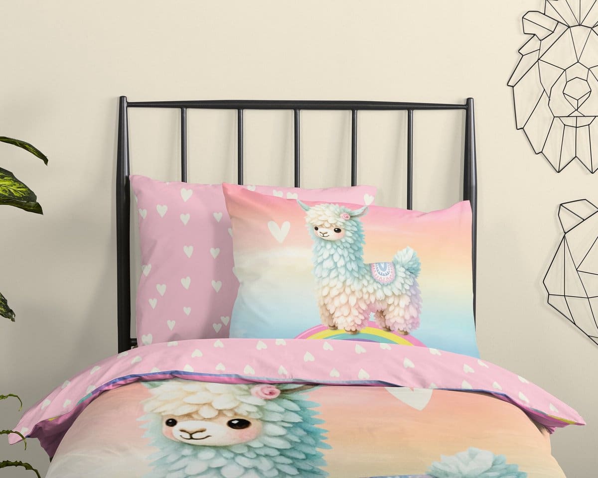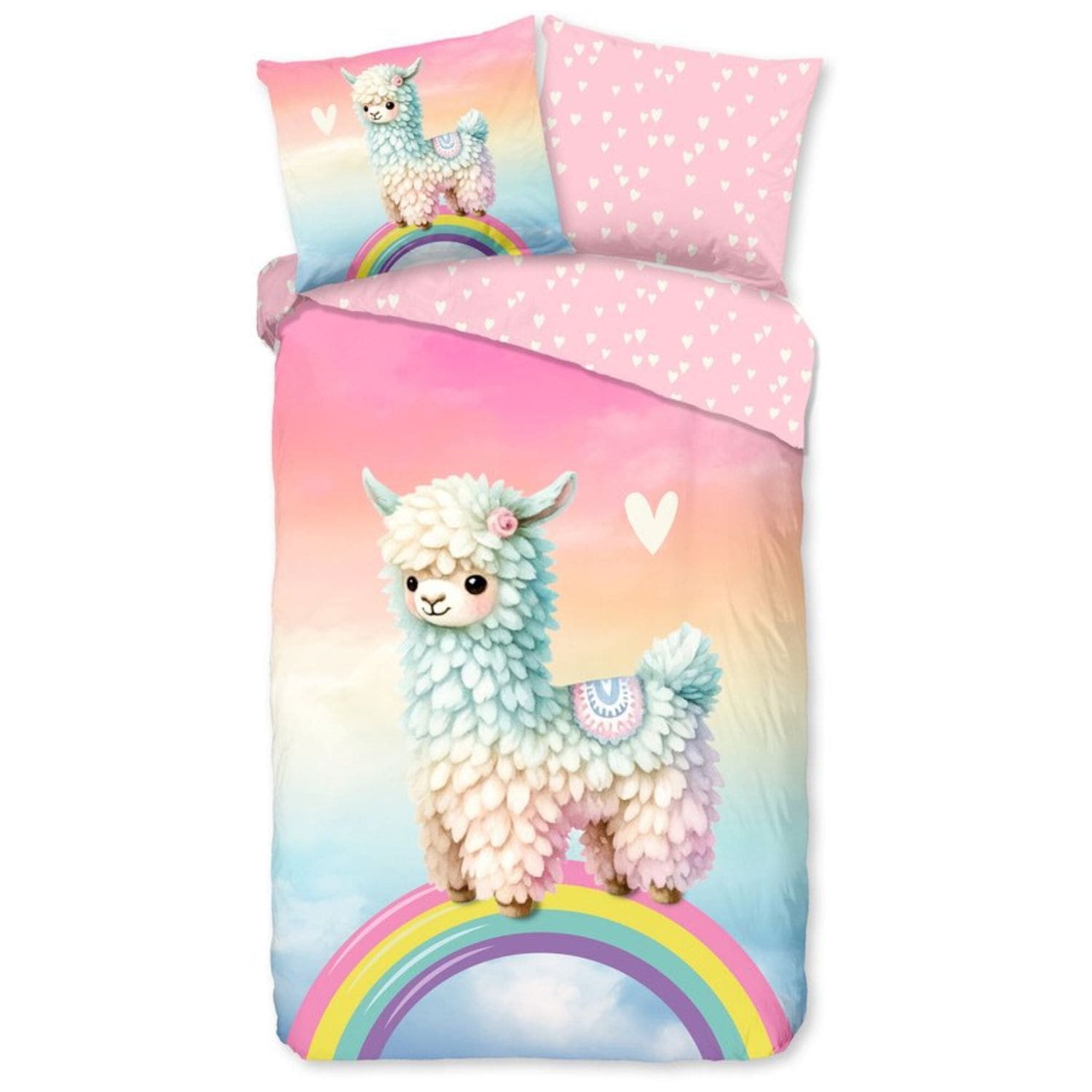 Droom iedere avond heerlijk weg onder het Good Morning Chico dekbedovertrek. Op het overtrek staat een super schattige lama die over de regenboog heen loopt. Op de ondergrond loopt de roze kleur over in lichtblauw. De achterzijde is roze met witte hartjes. Hierdoor kun je zelf kiezen voor welke print jij kiest!