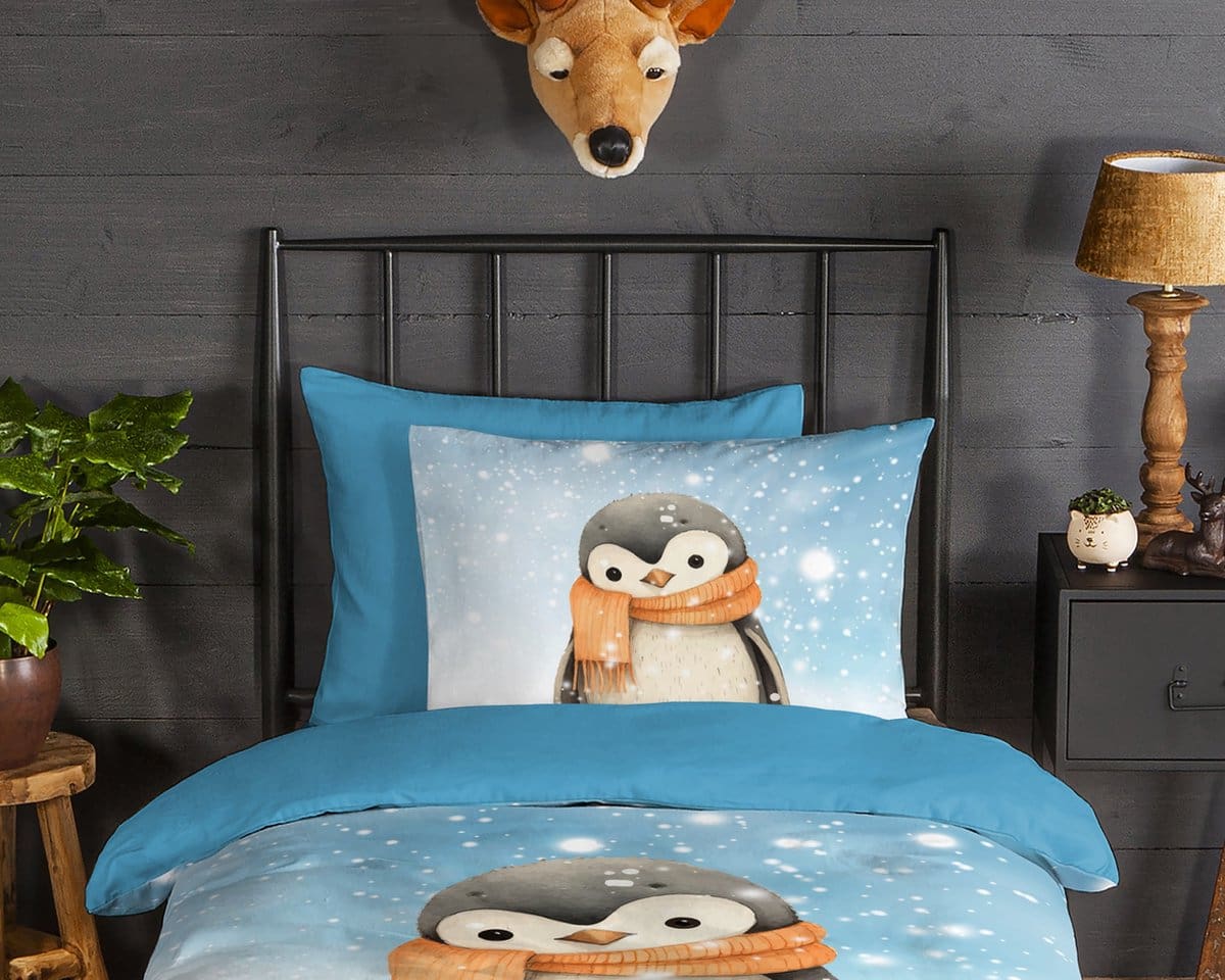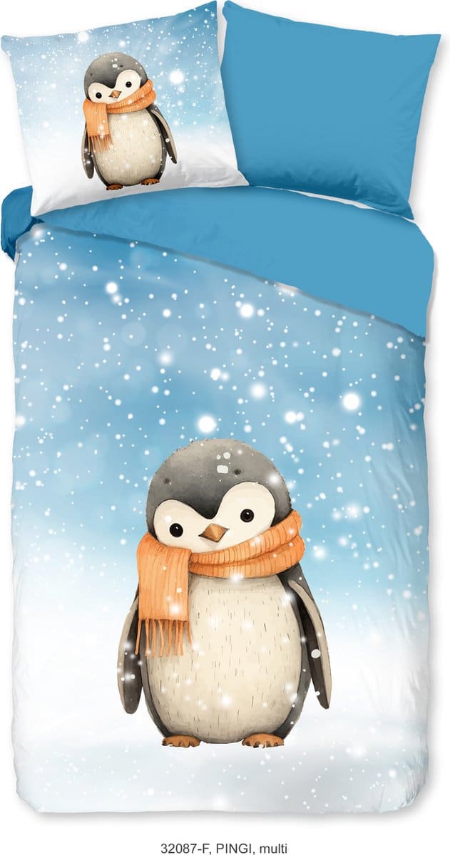 Breng winterse gezelligheid naar de kinderkamer met dit superzachte flanellen kinderdekbedovertrek van Good Morning. Het lieve ontwerp toont een schattige pinguïn met een warme sjaal, omringd door een blauwe achtergrond vol speelse sneeuwvlokjes. Perfect om in weg te kruipen tijdens koude nachten.