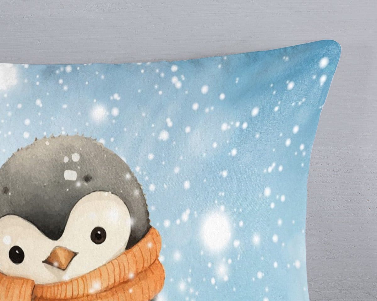 - Design: Schattige pinguïn met sjaal op een achtergrond met sneeuwvlokjes